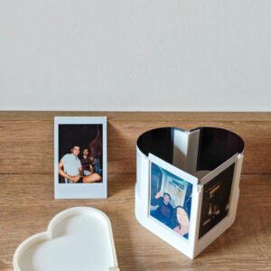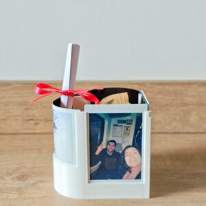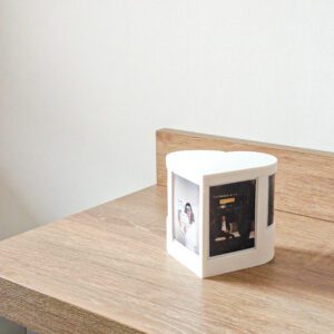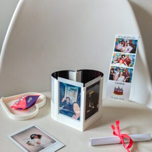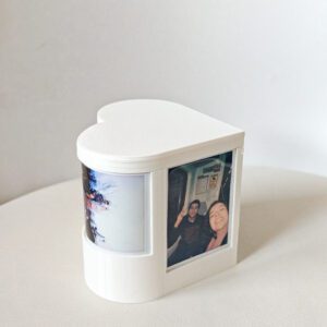 Este portafotos está diseñado especialmente para fotos tipo Instax y permite exhibir 4 recuerdos al mismo tiempo 📷 — dos en posición vertical y dos siguiendo las curvas del corazón, integrando las imágenes directamente al diseño.