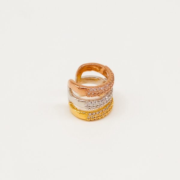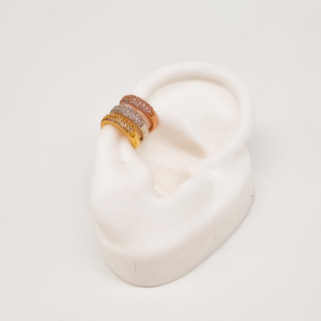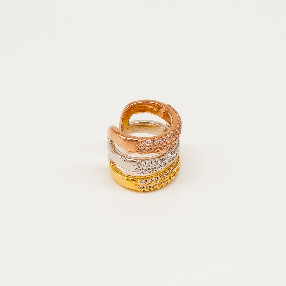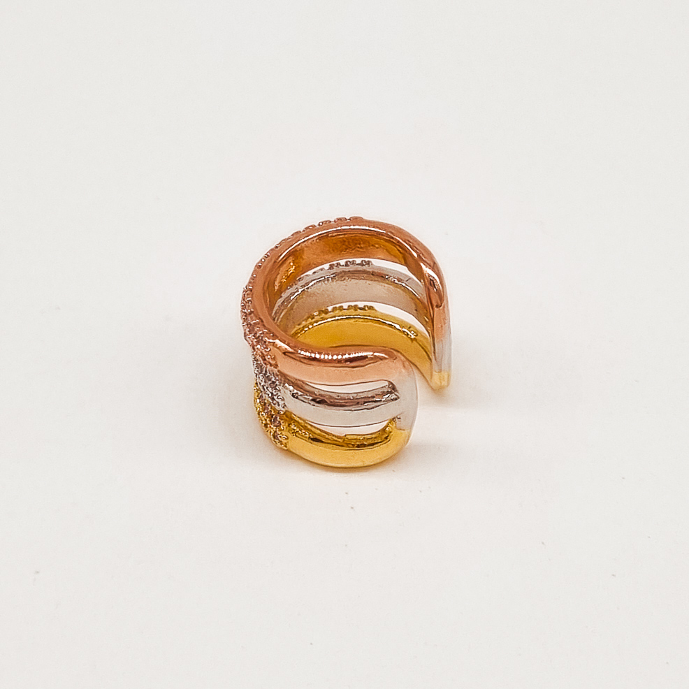 Es una pieza que combina la belleza y sofisticación de tres tonalidades: dorado, plateado y oro rosa. Este diseño único añade profundidad y brillo a tu look, permitiéndote destacar con un toque de elegancia moderna. Con un acabado texturizado y sin necesidad de perforaciones, este earcuff es ideal para quienes buscan un estilo versátil y refinado.