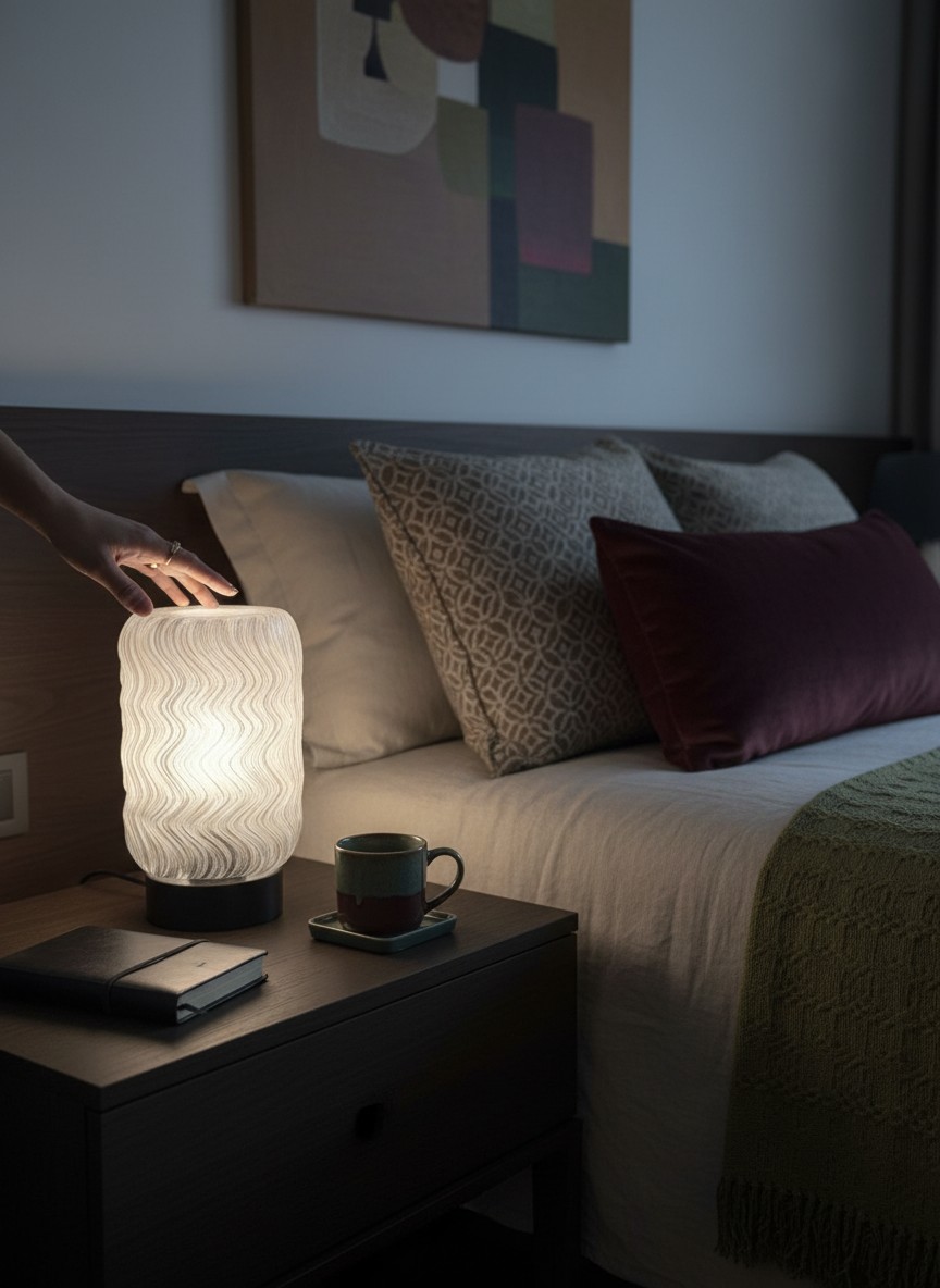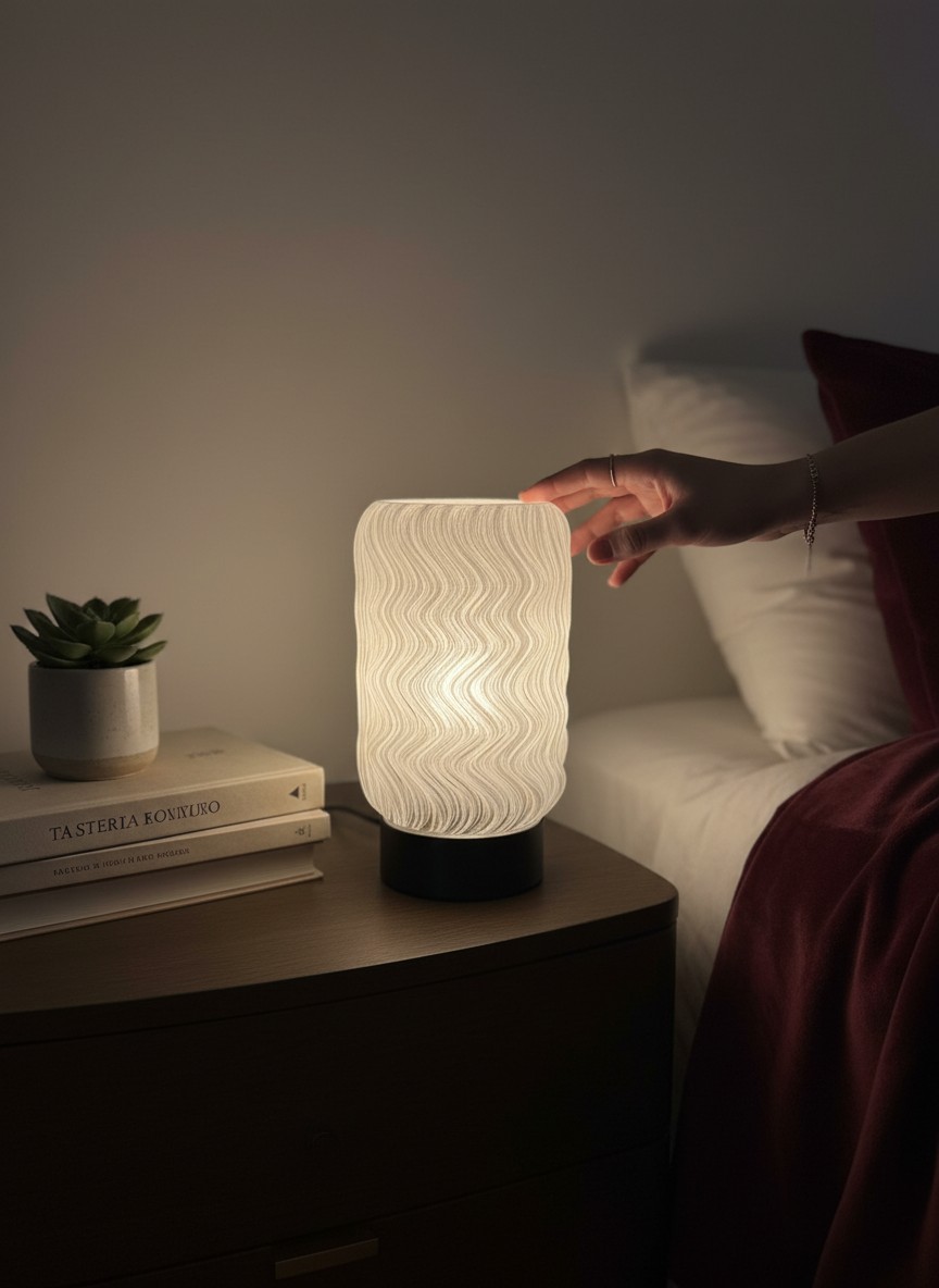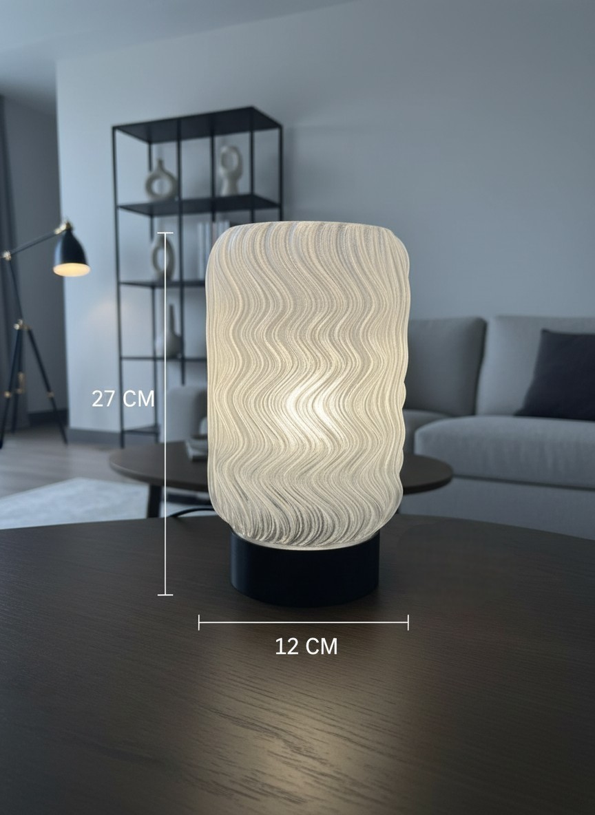 La lámpara Brisa combina iluminación funcional y diseño decorativo en una pieza pensada para transformar cualquier espacio. Su forma cilíndrica y su textura de ondas suaves crean un efecto visual elegante, moderno y envolvente, haciendo que destaque tanto encendida como apagada.