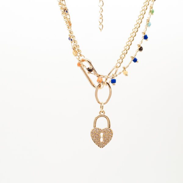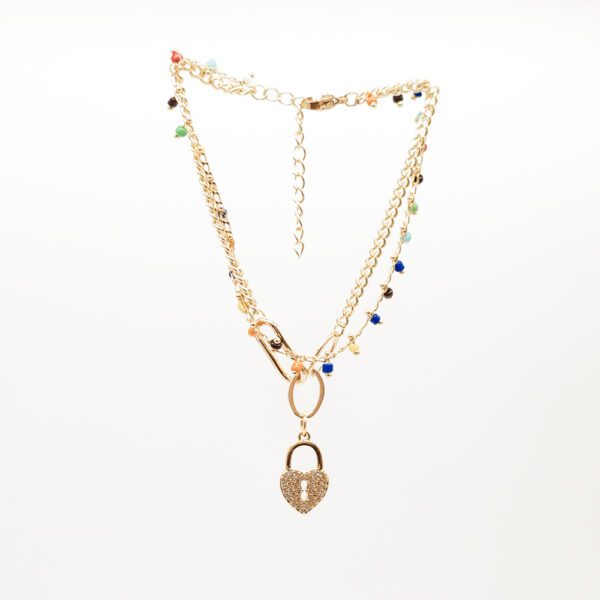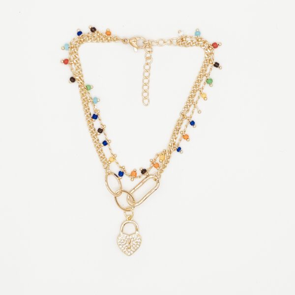 Esta pulsera de doble cadena combina detalles multicolor con un dije de candado en forma de corazón, creando un look alegre, moderno y con un toque romántico. Perfecta para quienes aman los accesorios con personalidad y quieren darle vida a su outfit.