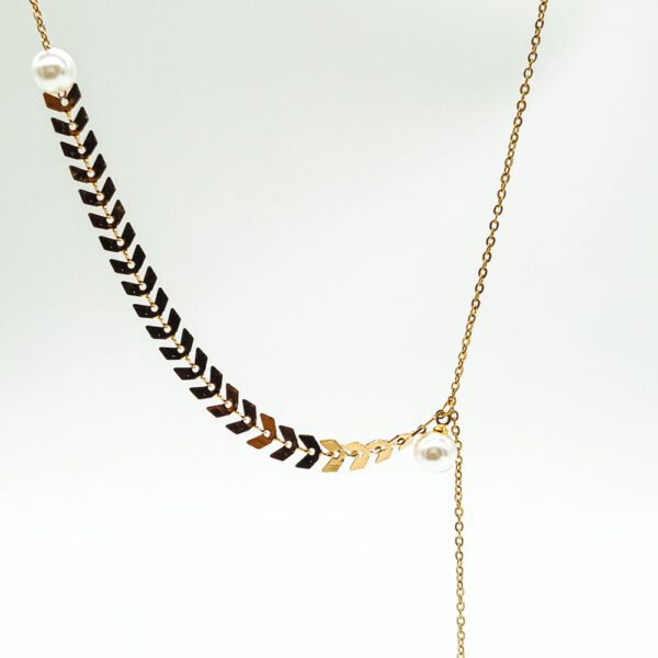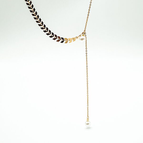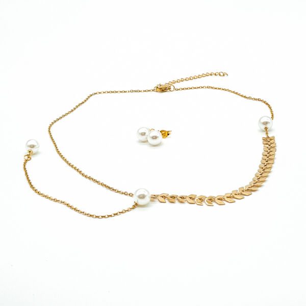 Este set combina un collar tipo corbatín con diseño asimétrico y perlas colgantes, junto a unos aretes delicados que completan el look con sutileza. La mezcla entre estructura, caída libre y detalles clásicos lo convierte en una pieza moderna con alma femenina.