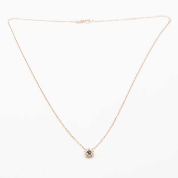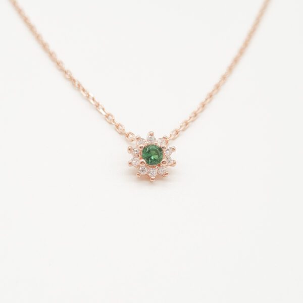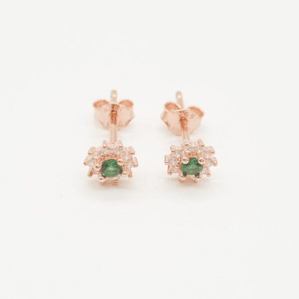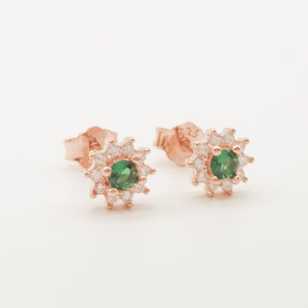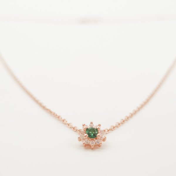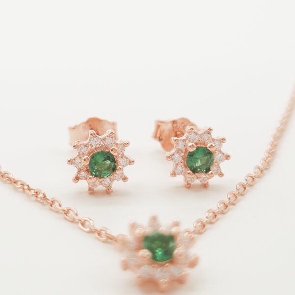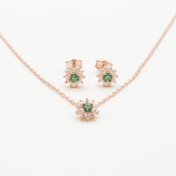 Un diseño delicado y encantador 🌟. Este set destaca por su dije mini en forma de estrella, con un brillante cristal verde en el centro y detalles brillantes alrededor. El collar y los topos a juego están elaborados en plata esterlina 925 con baño en tono rose gold, perfecto para quienes aman los detalles sutiles y femeninos 💚.
